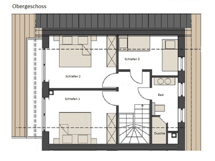 Das dritte Schlafzimmer ist mit zwei Einzelbetten ausgestattet. Alle drei Schlafzimmer verfügen über doppellagige Plissees und Ambilight-Fernseher, die Dachfenster im 3. Schlafzimmer über Jalousien.
