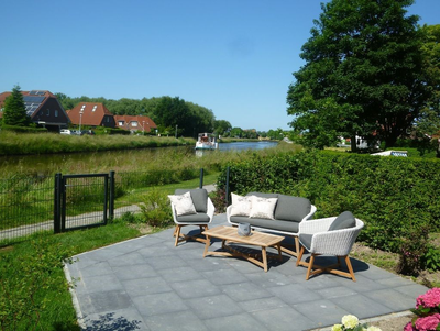 Auf der großzügigen nach Süden und Westen ausgerichteten Terrasse können Sie entspannen und das Treiben auf der Harle beobachten. Von dieser Seite der Doppelhaushälfte genießen Sie den direkten Blick auf Yachthafen und Segelschule. Der Elektrokamin sorgt nicht nur bei stürmischen Wetter für eine angenehme Wohlfühlatmosphäre. Eine Glastür schirmt die oberen Schlafräume vor Lärm